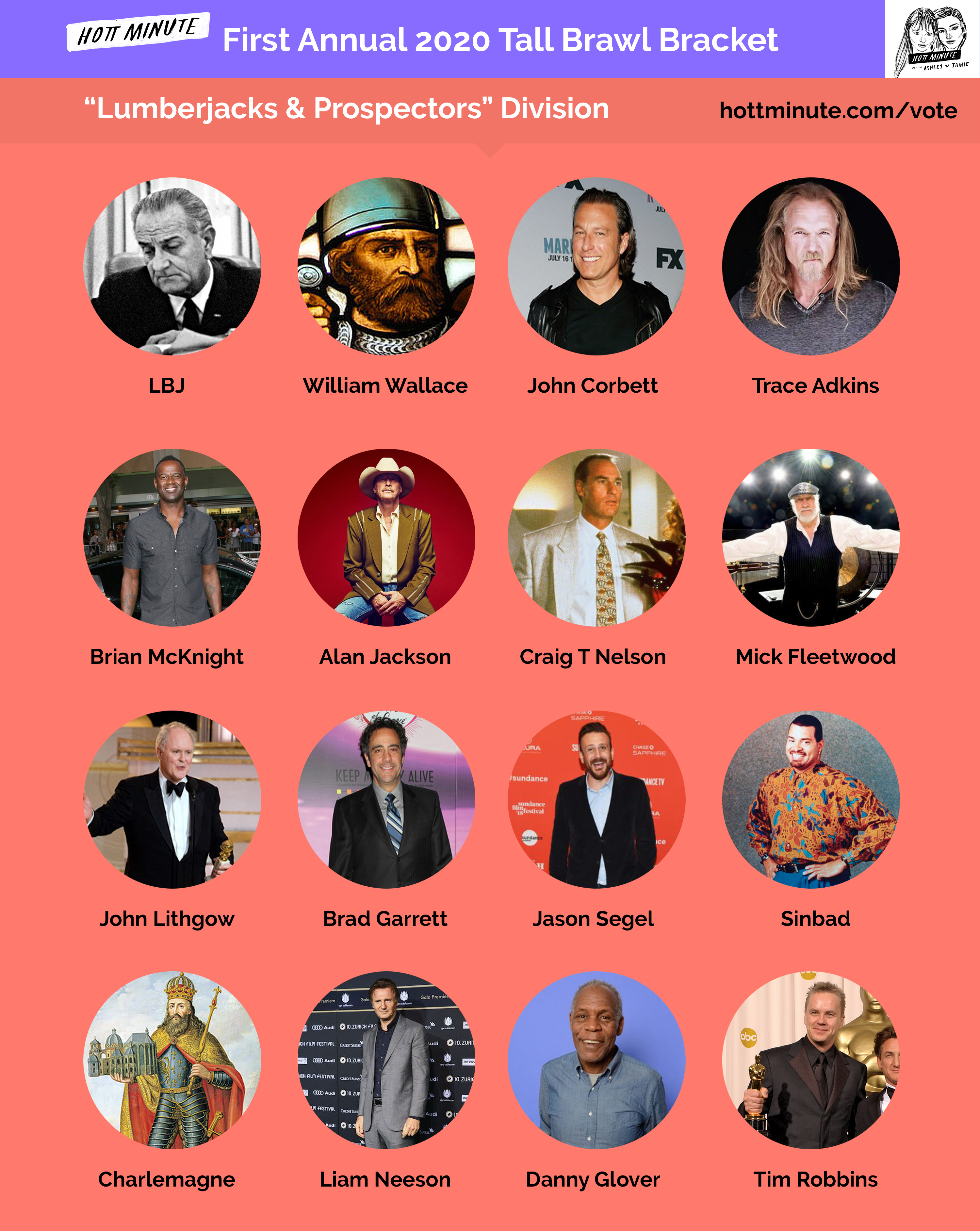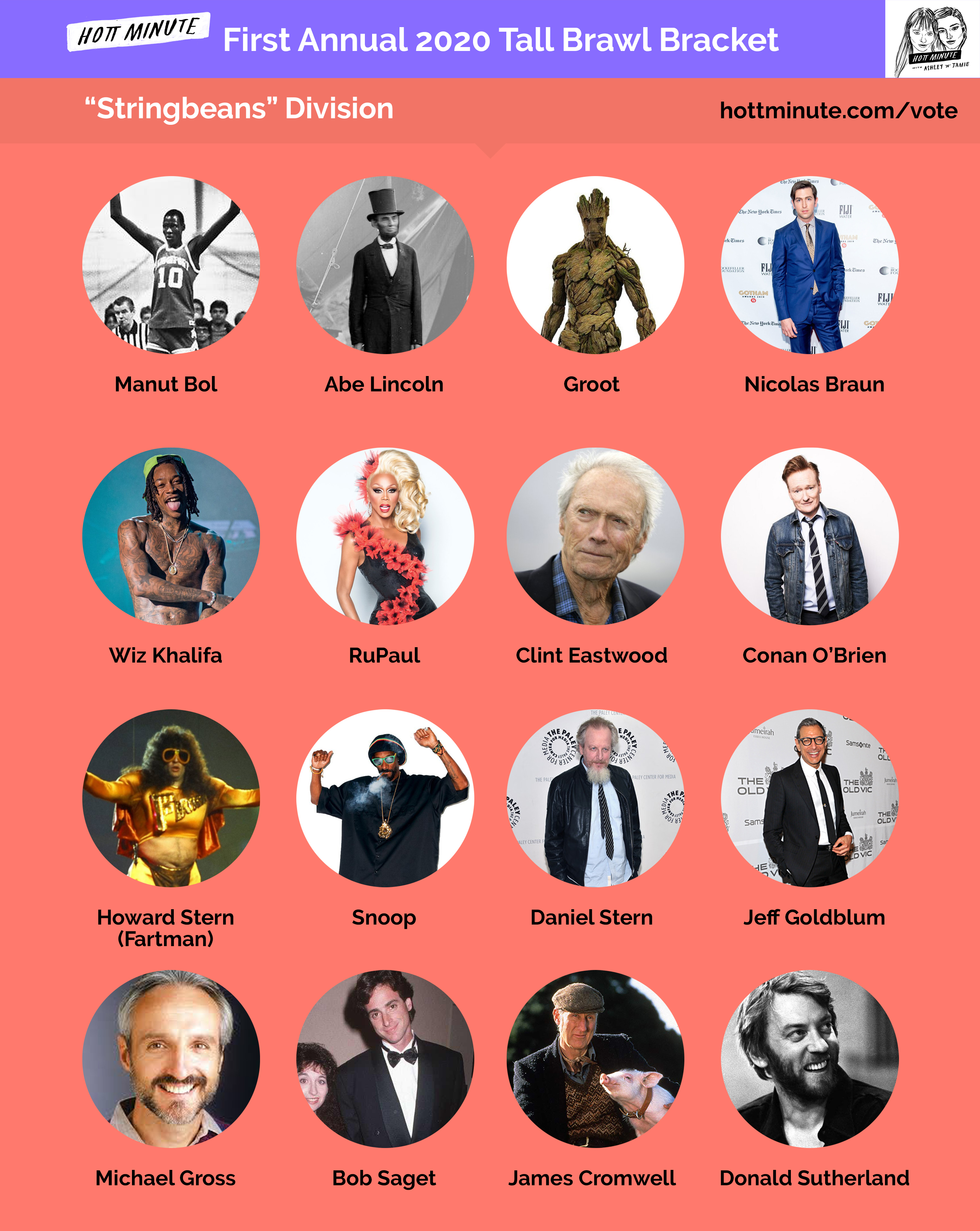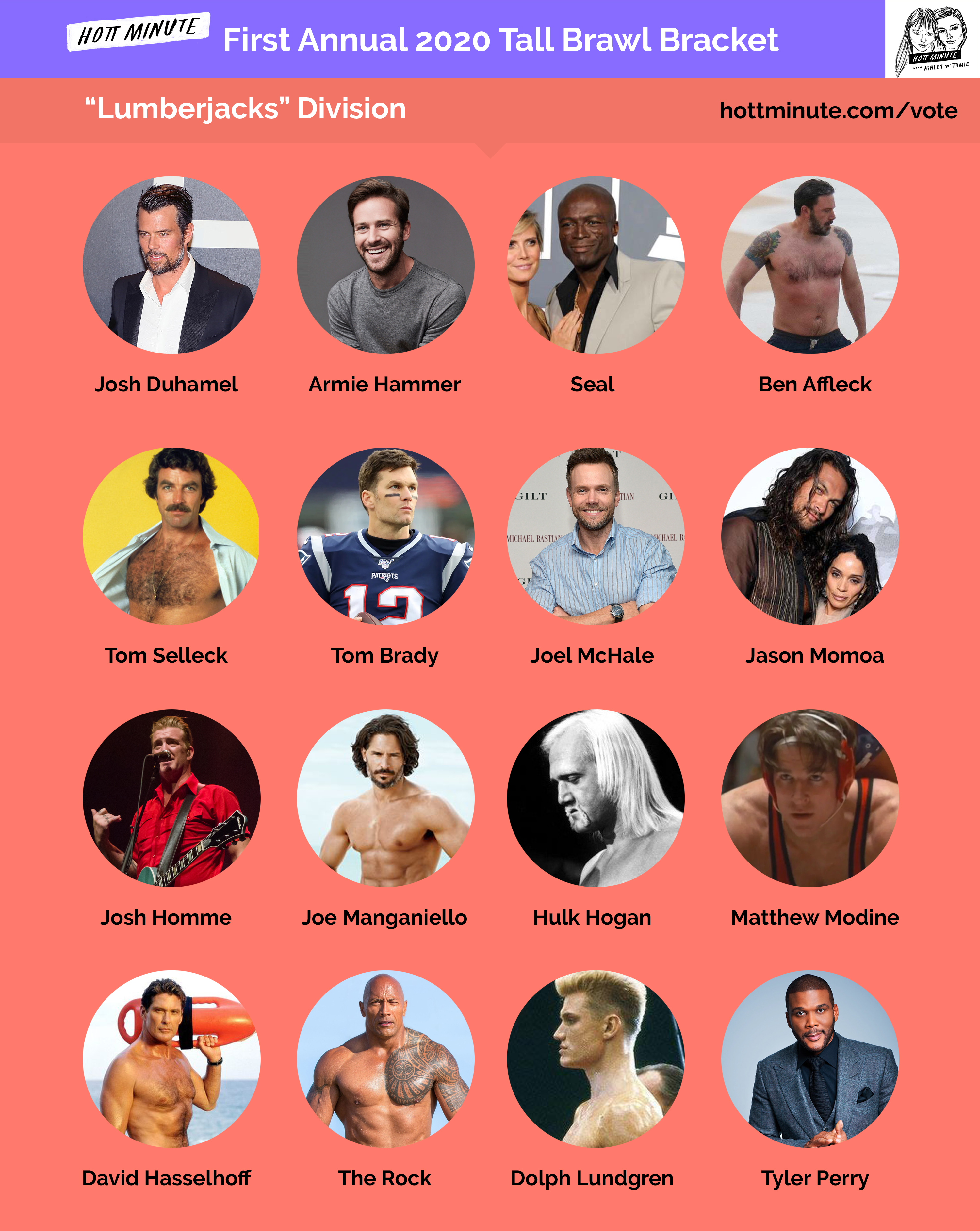 Introducing the First Annual Tall Brawl Bracket: 2020 Big Boy Melee! In the grand tradition of absurd Hott Minute undertakings, Ashley and Jamie have hand selected sixty-four hotties all over 6'3" tall to go head-to-head in an all out brawl. Divided into the sensible divisions of Stringbeans, Beefcakes, Lumberjacks and "Other", these literal giants will be voted upon to see who emerges as the winner. This episode, you will be introduced to every competitor and then asked to make your selections for the impending combat over at HottMinute.com/Vote or via @hottminute on Instagram.